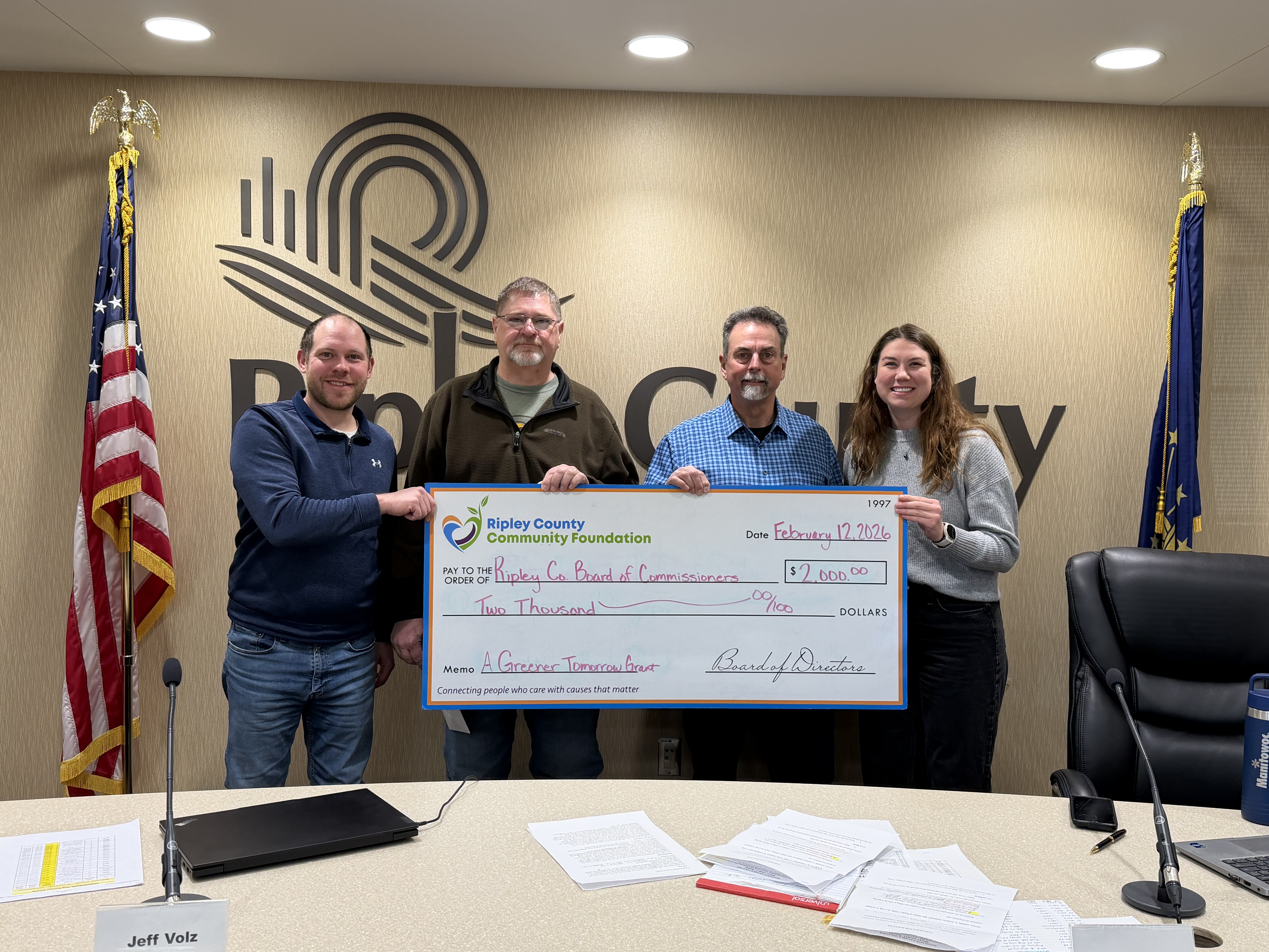 On Thursday, February 12, the Ripley County Commissioners pictured above from left, Mark HorstOn Horstman, Roger Gullion, and Jeff Volz, were happy to receive a $2,000 grant from Lexi Brown with A Greener man, Tomorrow. The grant was awarded to plant new trees on the courthouse lawn, which has already been completed. Commissioner Gullion had applied for the grant.