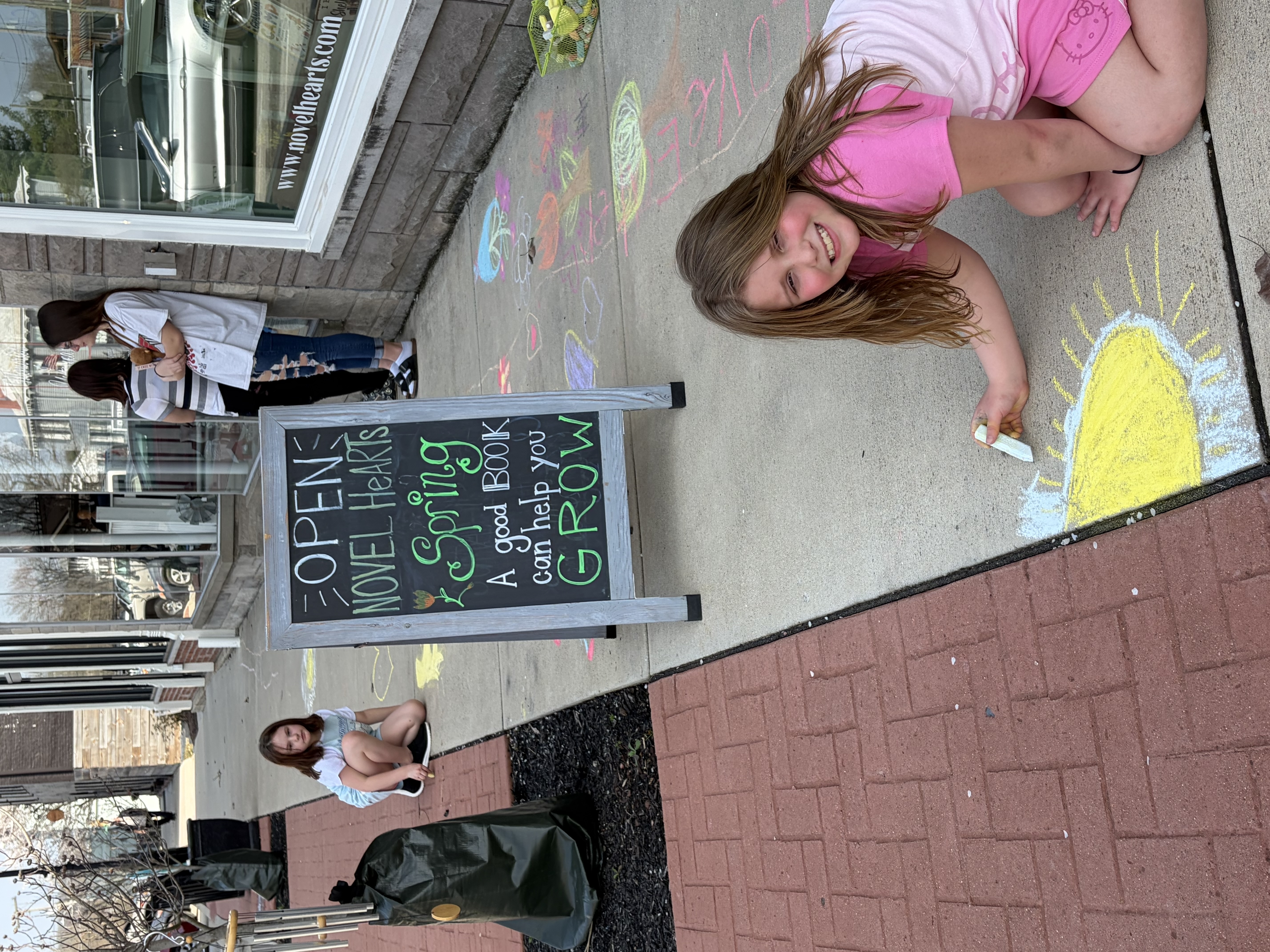 Amilya Chapman, 9 of Rising Sun, (pictured in front) and Mya Richardson, 7, of Rising Sun (pictured in back) are creating works on art on the sidewalk on the square in Versailles in front of Novel HeARTS. A container of sidewalk chalk had been provided for the children to use. Olivia Evans and Naomi Evans, of Versailles, were providing childcare for the children last week as they were on spring break.