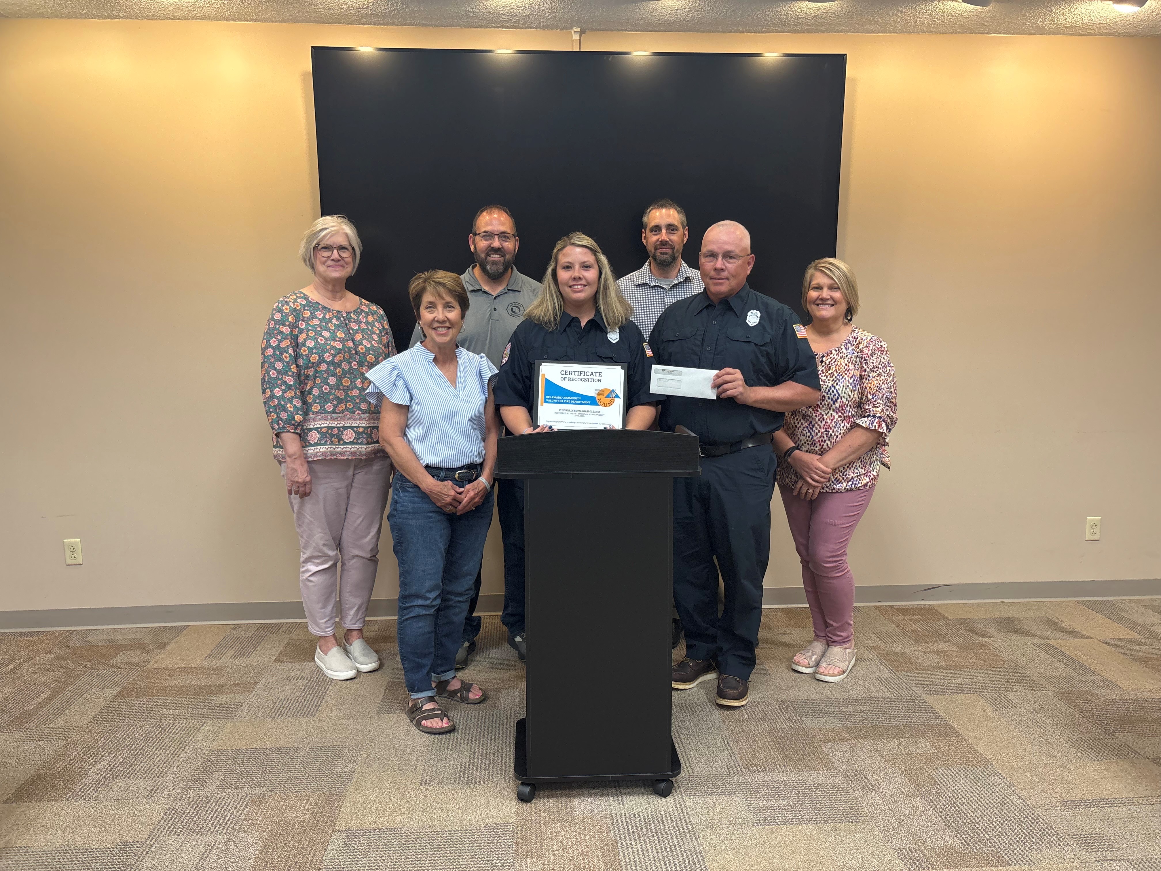 The Delaware Community Volunteer Fire Department was honored to receive a $2,500 grant from Decatur County REMC’s Operation Round-Up program during a recent presentation. Pictured from L to R, back row: Becky Metz, Eric Stone, Craig Koors, Hope Moore. Front row: Joyce Holtkamp, Baylee Dwenger, Melvin Dwenger