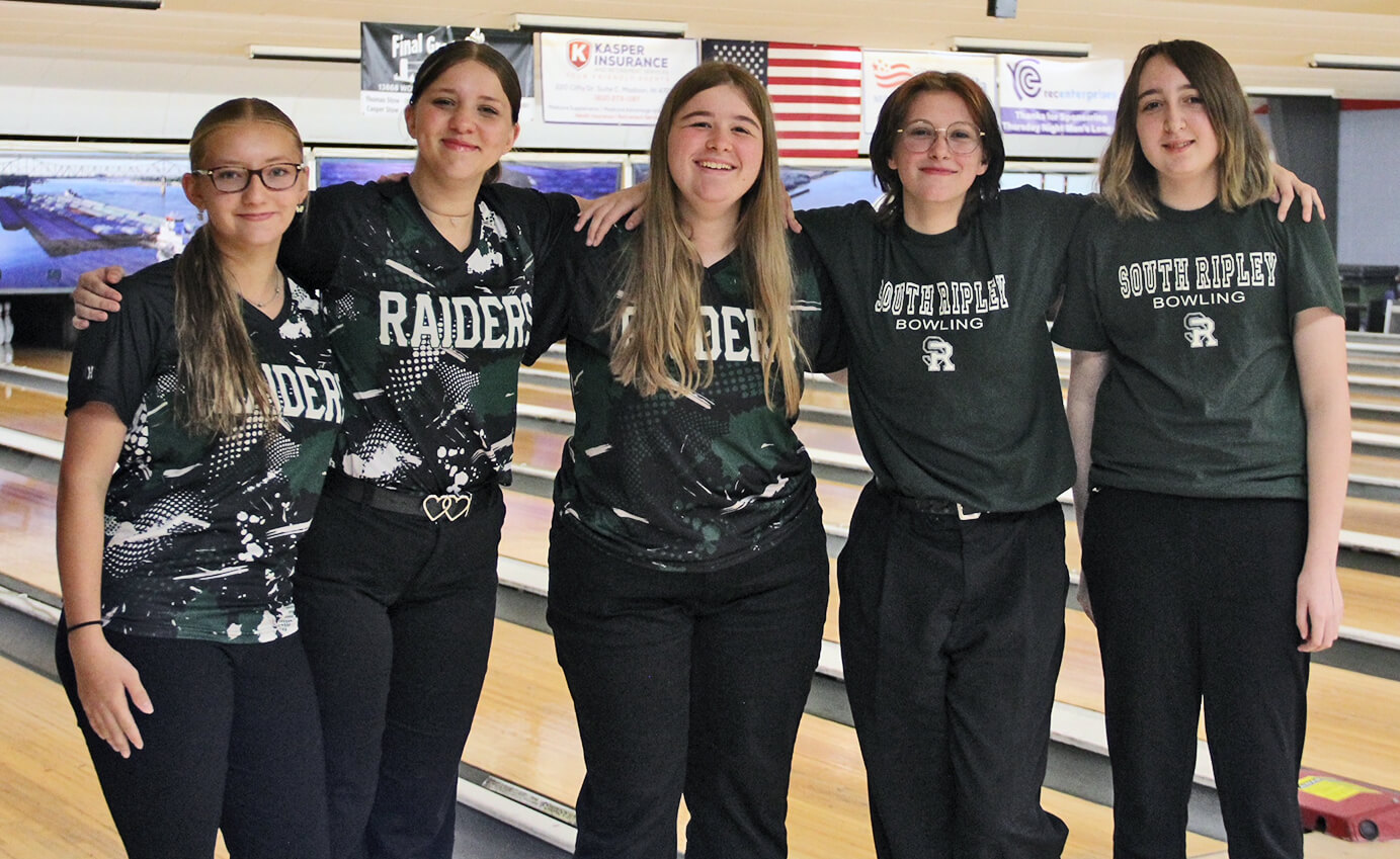 South Ripley’s girls bowling team went 1-1 this past weekend and now looks forward to competition in Lawrenceburg this week. Pictured from left-to-right are Kelsey McCarthy, Lydia Sons, Kourtney Riddle, Kelly Harrison and Lila Kissell. Not pictured is team member Charley McGrew.