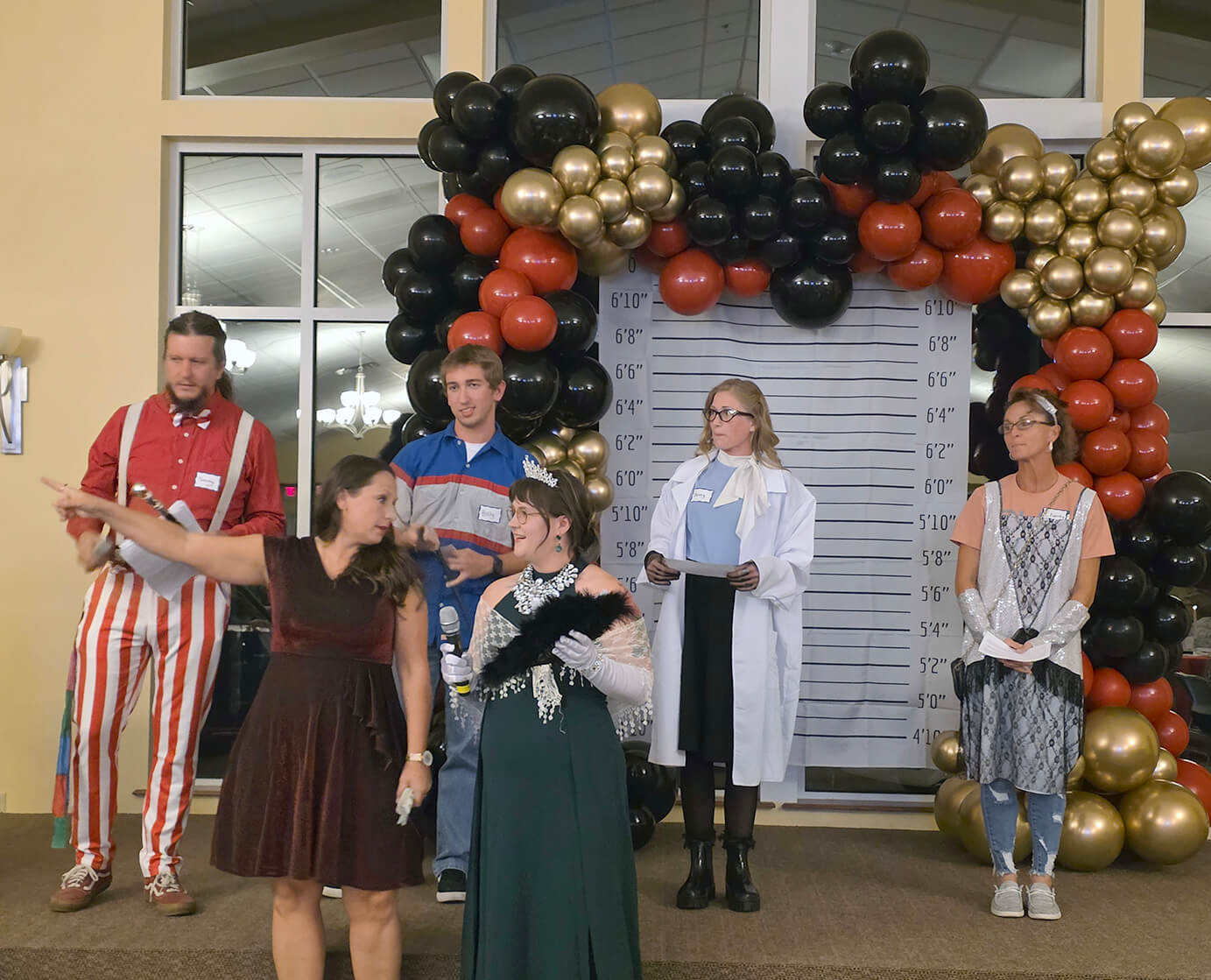 Pictured is Brandi Merkel, Executive Director of the Ripley County Chamber showing off the cast for the mystery dinner put on by Cincinnati Circus Co. at the Annual Dinner and Awards Night for the Chamber. Pictured with Brandi is Eva Diva (Cincinnati Circus Co. actor) Back row left to right: Tommy Talent (Cincinnati Circus Co. actor), Billy the Mechanic played by Henry Peters, Sweet Jenny played by Avery Perkinson, and Charity Case played by Penny Binnion. It was a great time for everyone to put their detective skills to work for fun at the event.
