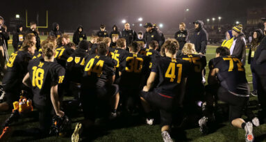 Milan head coach Ryan Langferman huddles his team together one final time this season after the Indians fell in Friday night’s Class A South Semi-State against South Putnam.