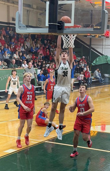 South Ripley’s Blake Gunter scores on Saturday night in the return to Tyson Auditorium. Gunter poured in 25 points, sparking the Raiders to a 70-56 win over the Chargers